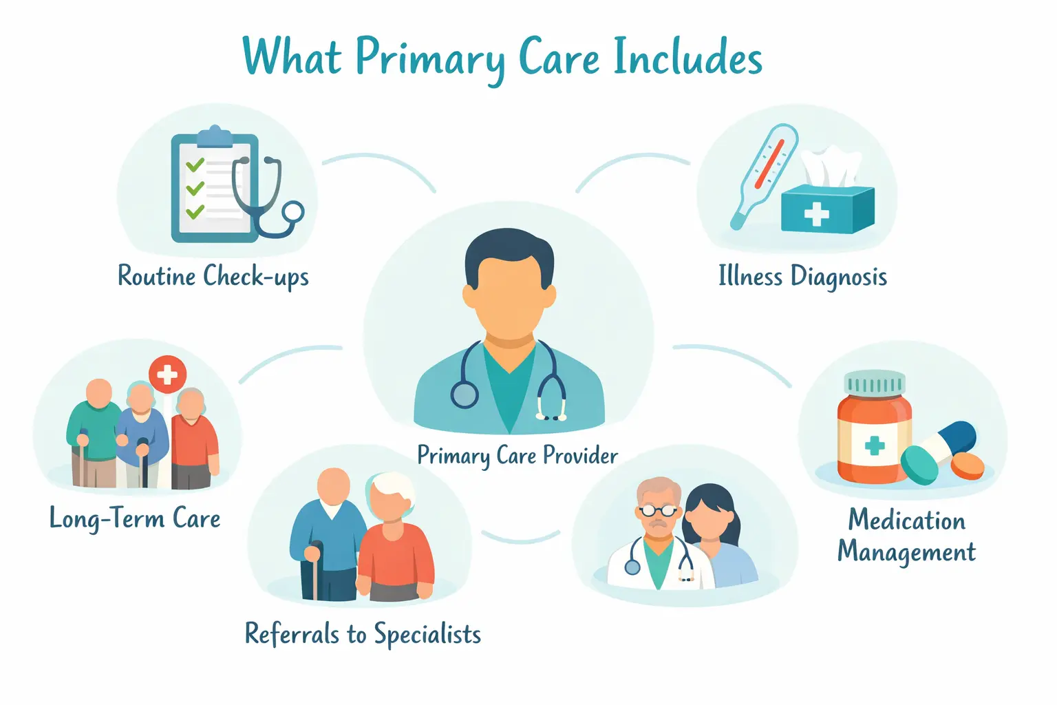Instead of only treating you when you’re sick, a primary care provider focuses on your overall health over time. The goal is to prevent problems when possible, find issues early, and manage any ongoing conditions in a steady, organized way.